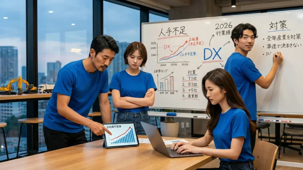 2026年の人手不足とDX対策について議論する、青いTシャツを着た4人のプロジェクトチーム。オフィスでホワイトボードのデータとタブレットの正社員不足率グラフを見ながら話し合っている。
