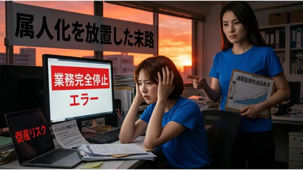 属人化を放置すると、一人の退職が業務停止を引き起こし、最悪の場合は倒産にまで至ります。